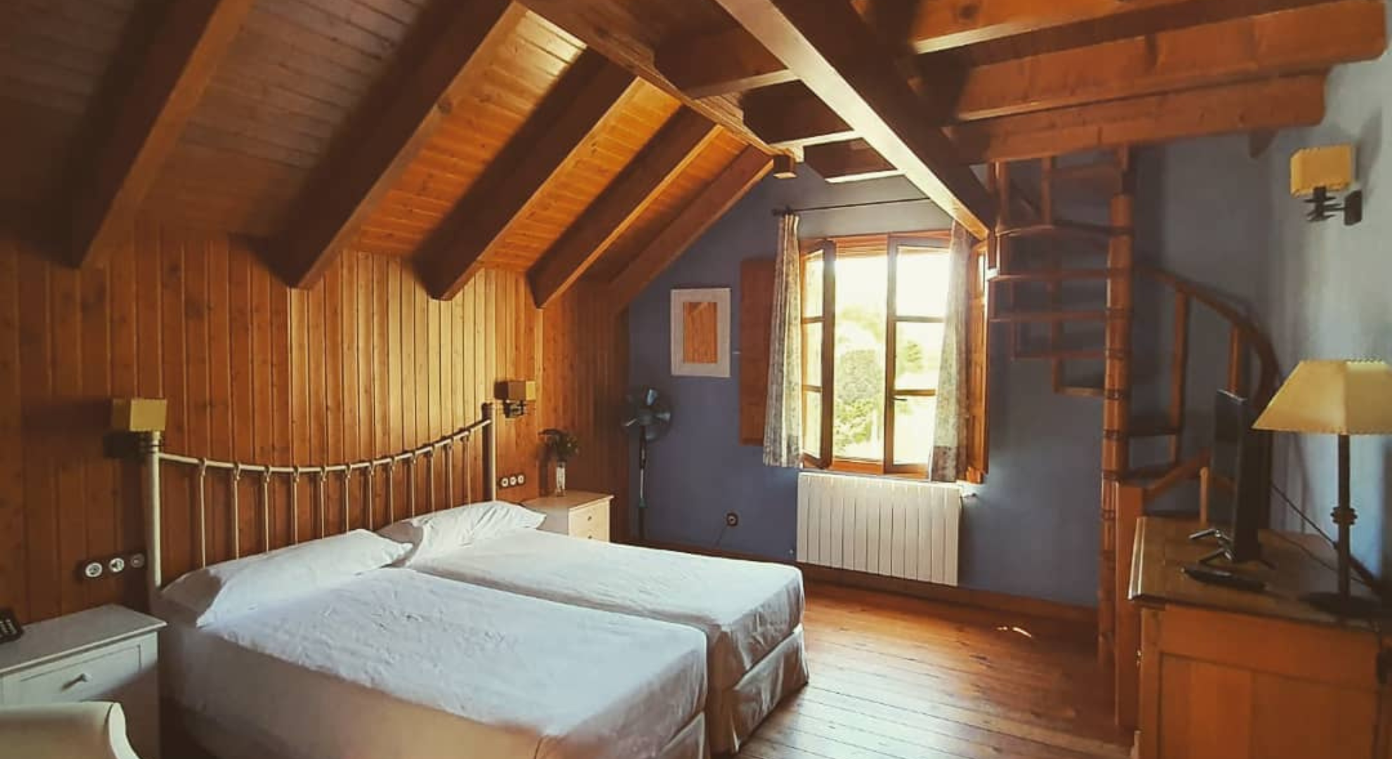 Habitación Junior-Suite. Abuhardillada. Pensada para parejas con niños. Se trata de una habitación con cama de matrimonio y altillo de madera. En el altillo pueden alojarse uno o dos niños, con TV independiente.